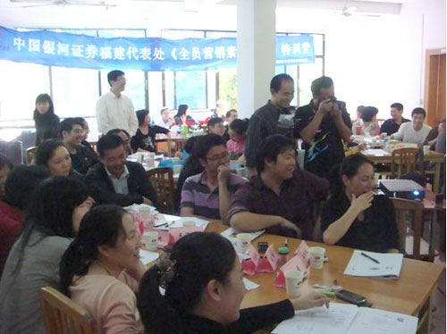 2009年11月8日,由深圳市玛思威企业管理咨询有限公司首席培训师朱俐安教授主讲,为期2天的中国银河证券股份有限公司福州代表处《全员营销素质提升》培训班在福州市圆满结束。朱教授以其多年的经验,悉心指导每位学员,大家纷纷表示受益匪浅,希望能够再次聆听朱教授的课程!